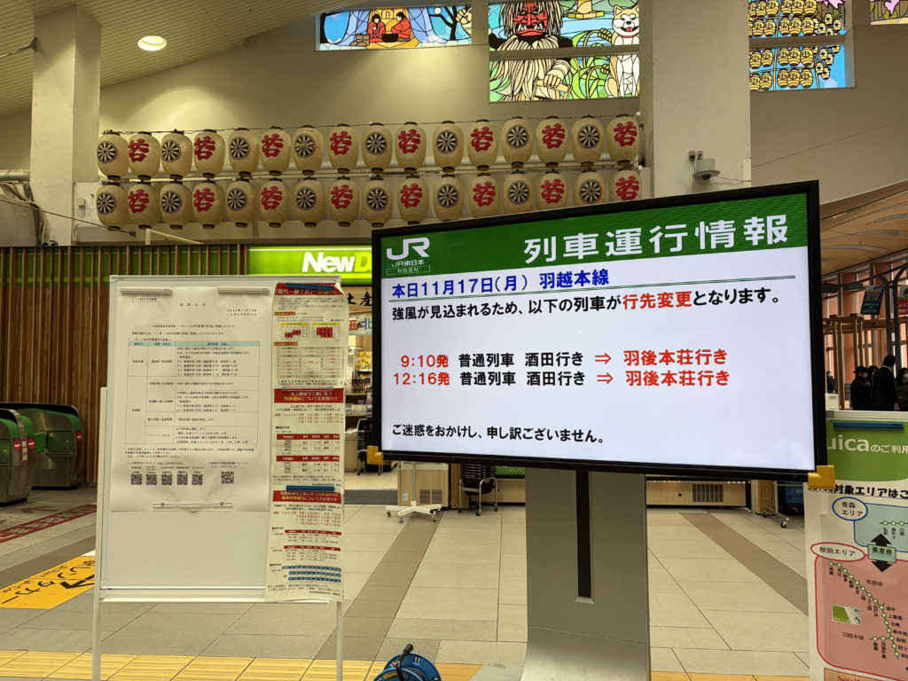 しかし、秋田駅に到着して電光掲示板を見た瞬間、目に飛び込んできたのは「羽越本線 運休」の赤文字。
