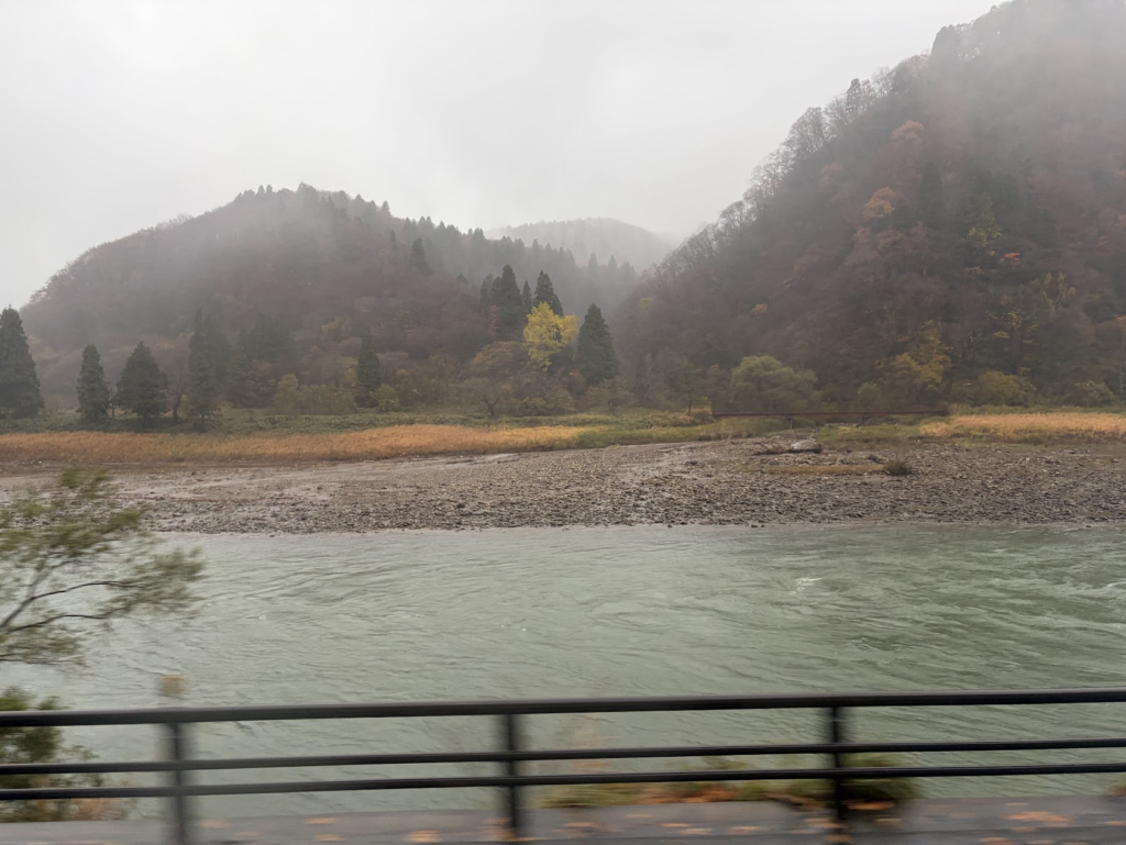 車窓からは、最上川や紅葉残る山々の風景。