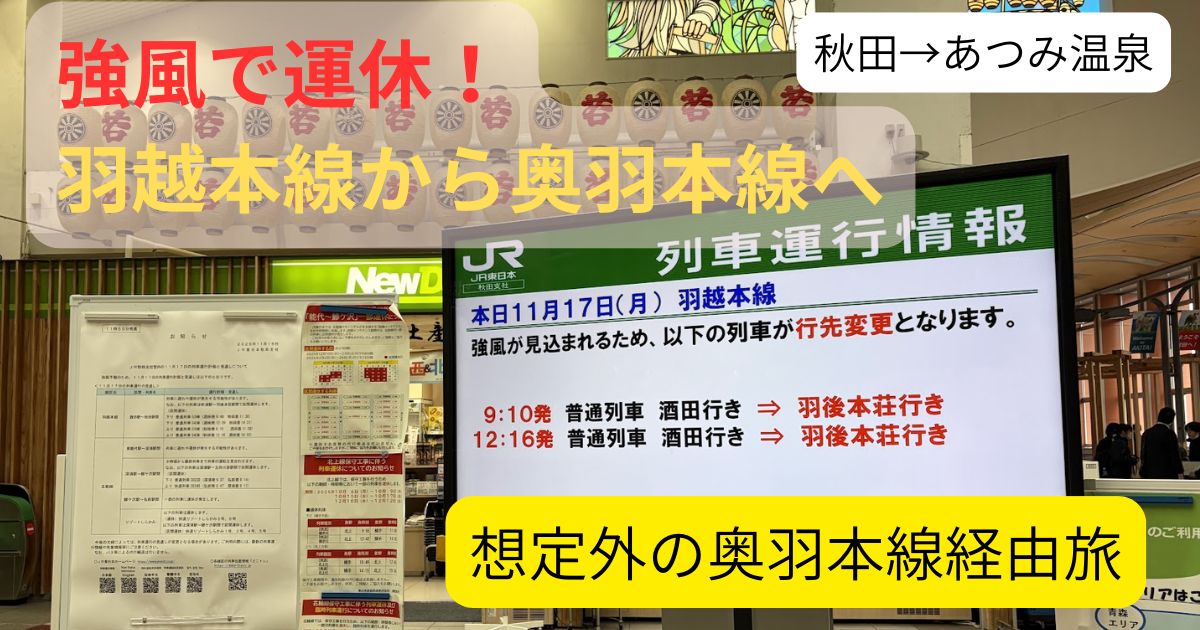 しかし、秋田駅に到着して電光掲示板を見た瞬間、目に飛び込んできたのは「羽越本線 運休」の赤文字。
